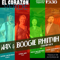 Wax & Boogie, es una formación especializada en el boogie woogie de los 30, el swing de los 40, y el Rythm and Blues de los 50. Al frente, la terrible voz de Ster Wax. Lavern Baker, Ruth Brown o Big Maybelle, sus grandes influencias. Al piano David “Boogie” Giorcelli, uno de los más serios exponentes del boogie piano en Europa, por lo que ha participado en festivales de prestigio en países como Francia, Suiza o Polonia. Oriol Fontanals al bajo y a la la batería, la destreza de Reginald Vilardell, baterista de los más solicitados en la escena del Blues nacional y también Internacional.