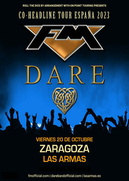 DARE, la banda inglesa de rock melódico liderada por Darren Wharton, ex teclista de Thin Lizzy, y compuesta también por Richard Dews, Andrew Moore y Kevin Whitehead girará junto a FM en cuatro fecha españolas. Dare surge a finales de los 80 dándose a conocer con la publicación de Out of the silence (1989), un trabajo dentro del género AOR que a día de hoy es uno de los clásicos del género. La banda endurece su sonido con su segundo álbum en 1991. Tras siete largos años la banda galesa vuelve a publicar un nuevo trabajo. Calm before the storm supuso un giro hacia las raíces celtas del grupo y la banda de Wharton añade un sonido folk rock. Junto con la incorporación de instrumentos tradicionales. En 2001 sale a la luz Belief, su álbum más exitoso. Siguiendo la línea de su anterior trabajo. Temas como "White horses" o "We were friends" se cuentan hoy entre los clásicos de la banda. Beneath the shining water (2004) mantiene la línea que marcaran sus predecesores incorporando además nuevos elementos electrónicos. Las letras se mantienen a un gran nivel, si bien para muchos el disco no alcanzó la calidad de sus dos predecesores. Un año más tarde se publica The power of nature, el primer álbum en directo de la banda, que recopila los principales clásicos del grupo galés. Road to Eden se publica en 2022 como un trabajo maduro y con la enorme calidad que caracteriza el sonido del grupo.