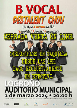 B Vocal presenta “Destalent Chou”, un nuevo espectáculo en el que el público va a poder disfrutar de tres ingredientes infalibles que convierten cada momento en una experiencia inolvidable: la música, la voz y el humor. Una fórmula mágica perfectamente mezclada, agitada y servida en una desternillante puesta en escena.