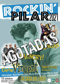 Rockin¨Pilar 2021, sigue apostando por la escena en su 30 aniversario y 50 del fallecimiento de Gene Vincet (donde su banda The Blue Cats actuó en 1991 en Zgz). Con un concierto de dos bandas de la escena local, Los Coringas + Raunchy (entre los que se encuentran Cuti y Francho, miembros de Los Dynamos), junto con artistas invitados como Manuel Villuendas & Sergio Joven (Los Vibrants), Six Xavier White (Los Twangs)+ Dj,s.